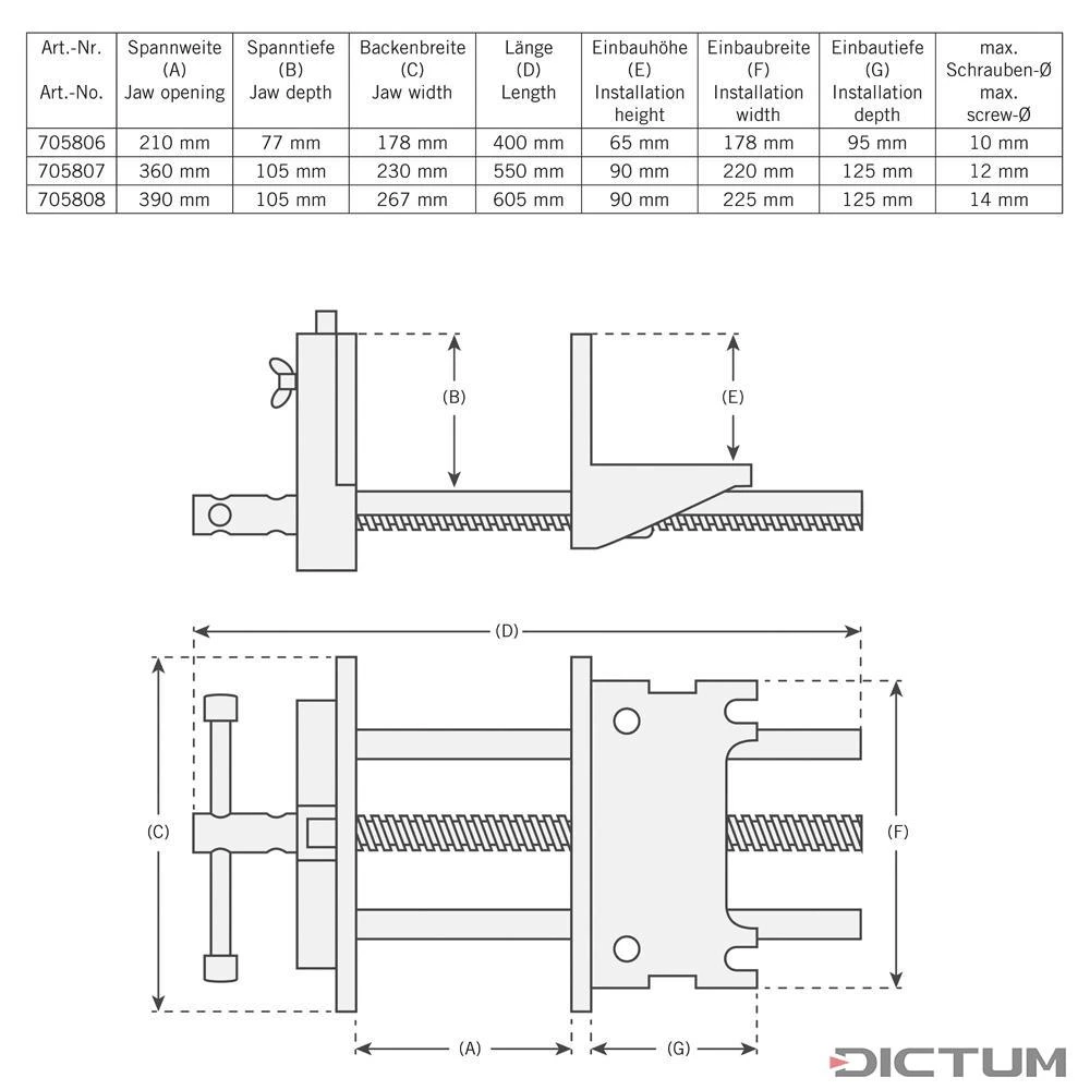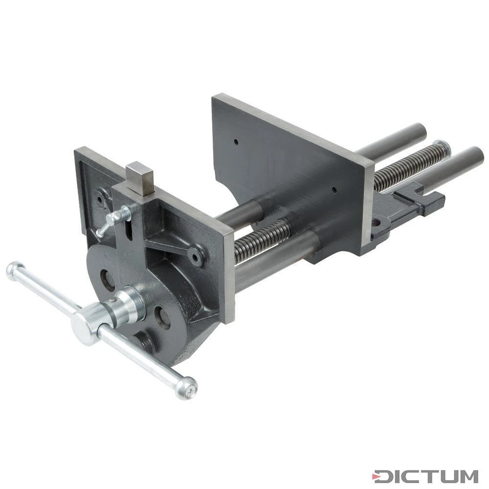 Étaux en métal solides pour le serrage précis et forte sur le banc de menuisier. Les mâchoires en fonte sont guidées pratiquement sans jeu par deux broches de 25 mm. La broche de serrage de 24 mm usinée précisément à filetage asymétrique est conçue pour les contraintes les plus élevées. Le valet d’établi extensible permet le serrage d’objets longs. Montage sans problème par vissage sous l’établi, alésages de mâchoires pour bois supplémentaires.