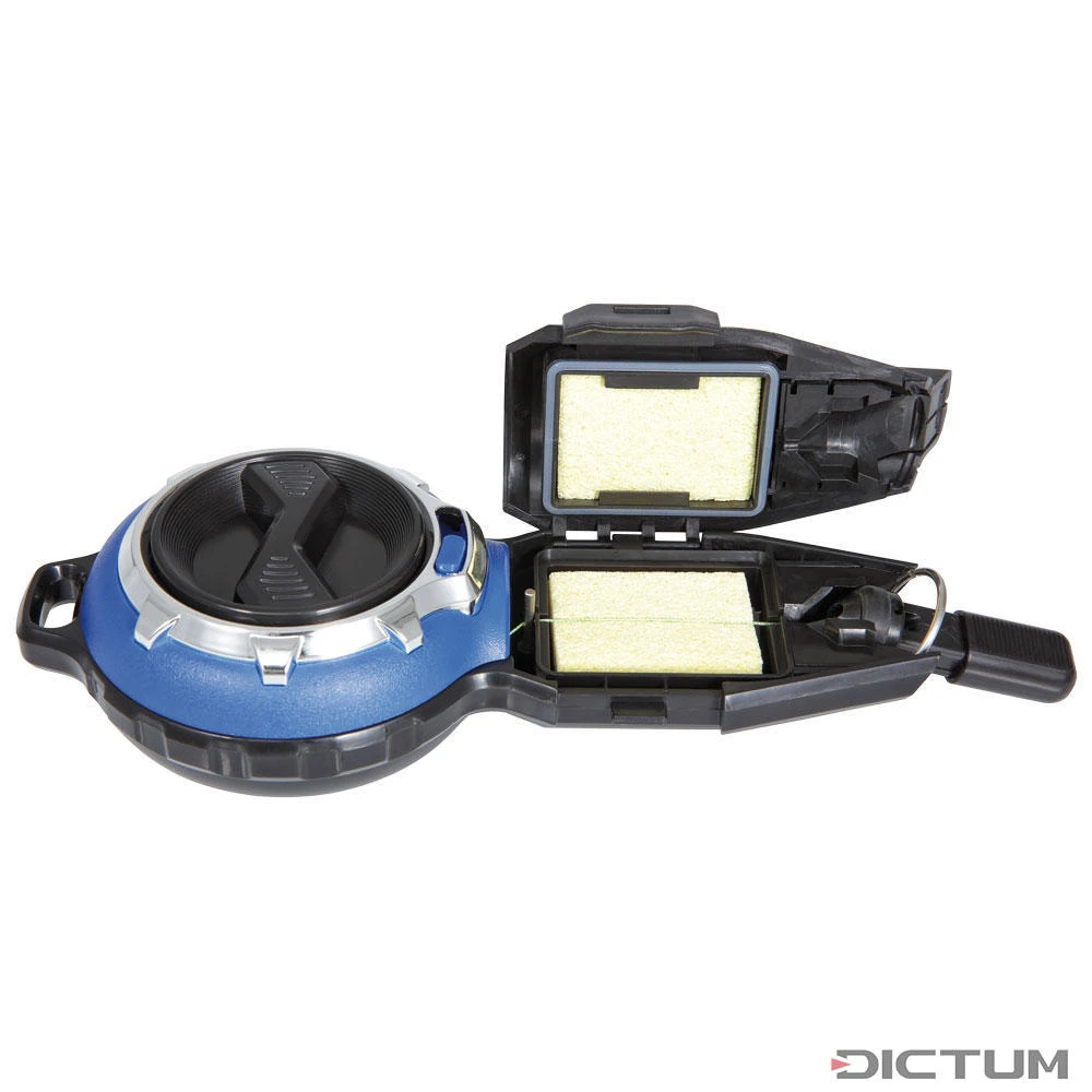 Comme pour un cordeau à tracer à la craie, une ficelle à tracer à l’encre sert à appliquer des lignes droites sur des composants en bois. On tire un fin fil de soie à travers un coton imbibé d’encre on le fait cogner la pièce à usiner en le maintenant tendu. De la sorte, on obtient des lignes exactes, extrêmement fines, même pour les pièces à usiner inégales comme par exemple les bois ronds et même sur des longueurs importantes (jusqu’à 10 m). Peut aussi être utilisé comme fil à plomb. Boîtier en matière synthétique solide, pas de perte, le fil se rembobine automatiquement. Sans encre, avec avec mode d’emploi. 180 x 80 x 40 mm.