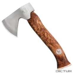 La hache » Vuogas Áksu «, de grande qualité et très maniable, offre une bonne prise en main grâce à son manche en bouleau madré teinté à la finition parfaite. L’extrémité en corne de renne et le logo inséré témoignent du traitement cohérent des matériaux naturels. Avec cette hache, vous disposez d’un outil aux finitions parfaites pour les activités de plein air et pour la chasse. La tête de hache polie en acier inoxydable est durcie à 54 HRC. Livré avec un étui en cuir tanné végétal, doté d’une boucle pratique qui permet de le porter à la ceinture ou de le fixer à un sac à dos. Livré dans un emballage cadeau haut de gamme, et comprenant un affûteur diamant dans un étui en cuir.