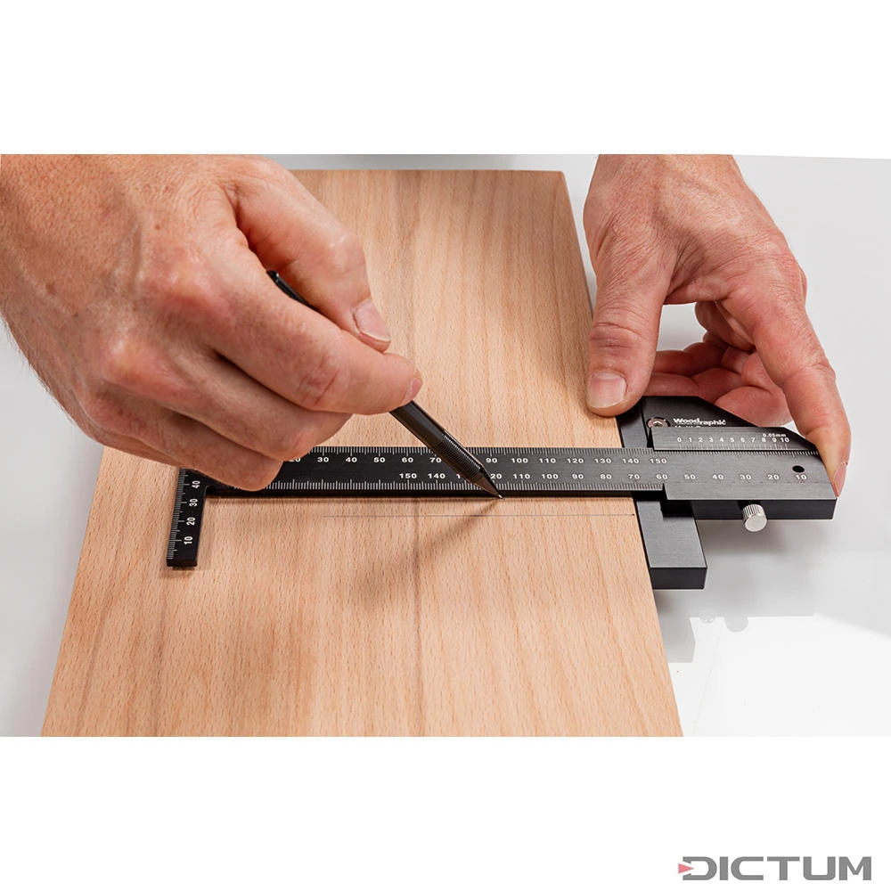 Pied à coulisse à tracer pour un marquage simple et précis des pièces, qu’il s’agisse de bords parallèles, d’angles de 90 ou de 45°. Règle à tracer avec graduation de 0 à 100 mm. Échelle de longueur avec échelle Vernier, précision de lecture 0,05 mm. Incl. réglage micrométrique fin et vis de blocage. En aluminium fraisé avec précision et surface anodisée. Échelles gravées au laser.